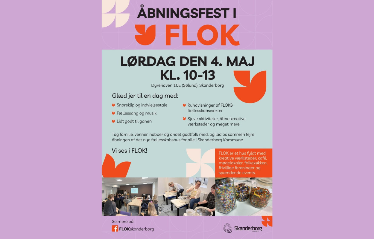 Kom til åbningsfest af det nye frivillig- og fællesskabshus FLOK på lørdag d. 4 maj fra 10-13.