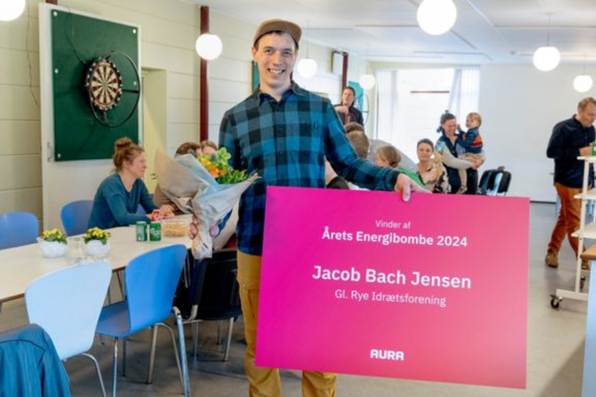 Med 32 procent af stemmerne er Jacob Bach Jensen fra Gl. Rye Idrætsforening vinder af Årets Energibombe. En pris som AURA hvert år uddeler til en frivillig i en lokal forening.
