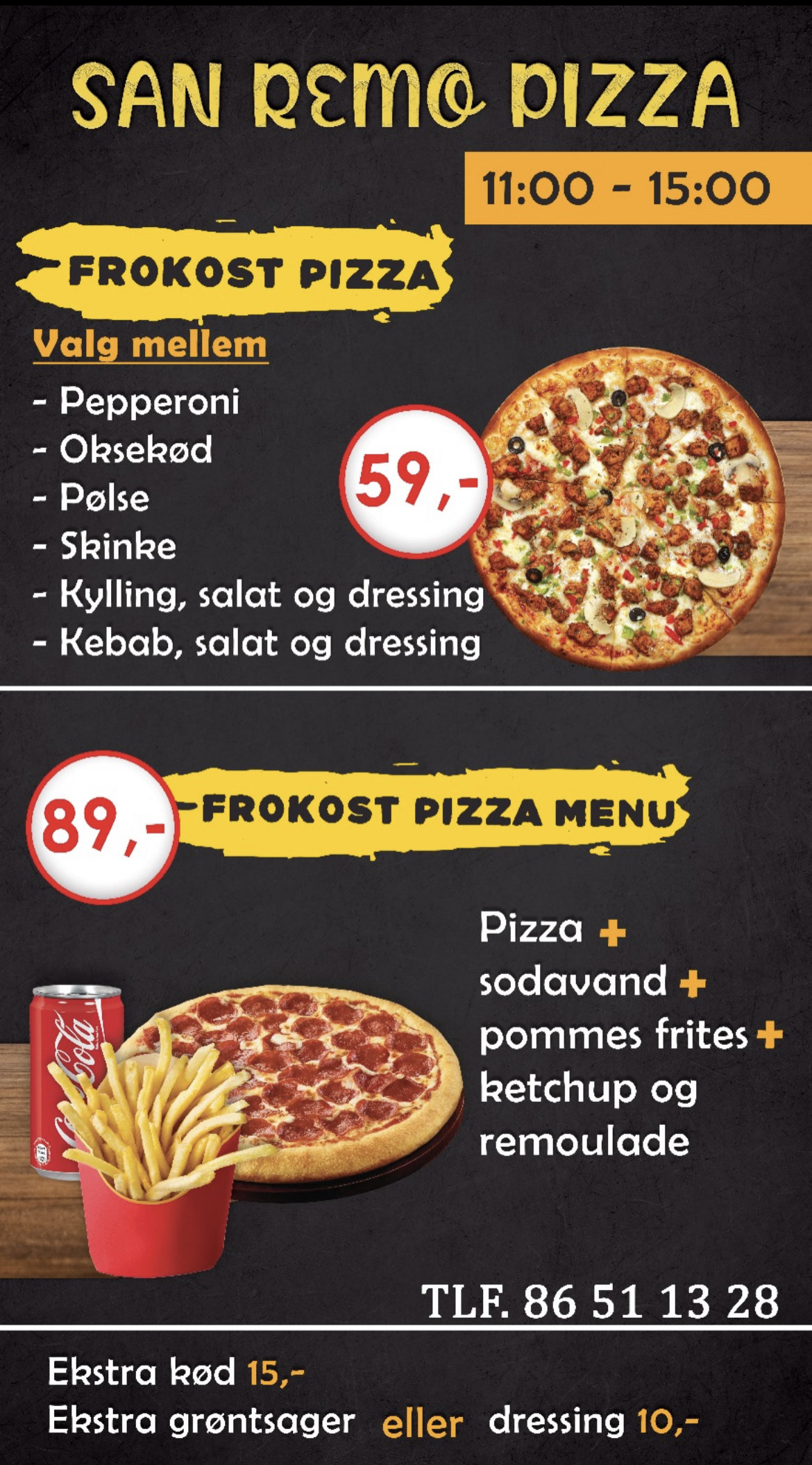 Hvis du ønsker en mere omfattende frokostoplevelse, kan du vælge at bestille frokostpizzaen som en menu. For kun 59 kroner får du en frokostpizza, en sodavand, en portion pommes frites med ketchup og remoulade.
